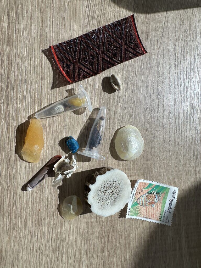 畳のへり、とか、種子とか、鹿の角の輪切りとか、水晶とか、切手とかw貝に珊瑚。がらく…風ではあるけれど、私はこういうのが好きです。