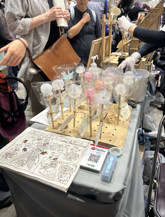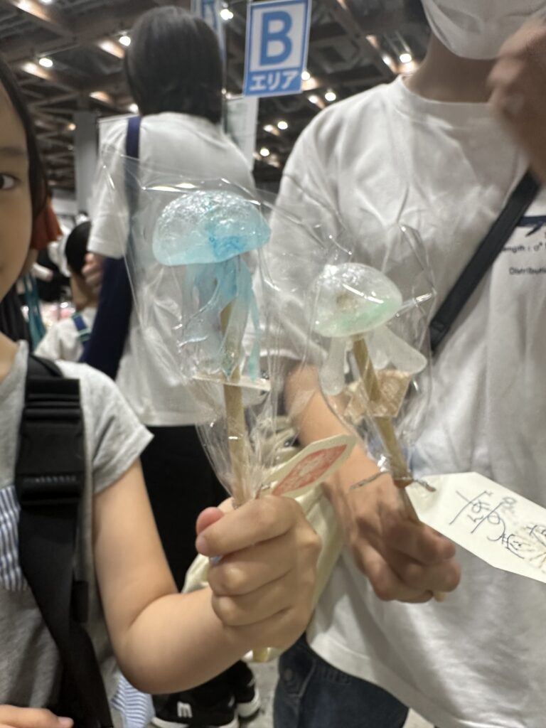 この美しすぎる飴は何でしょう、クラゲの飴なんて見た事ないです。綺麗すぎてテンションが爆あがりです。クラゲの種類も選べて…カツオのエボシを作ってもらってる方もおりました。色々シークレットあるそうで。