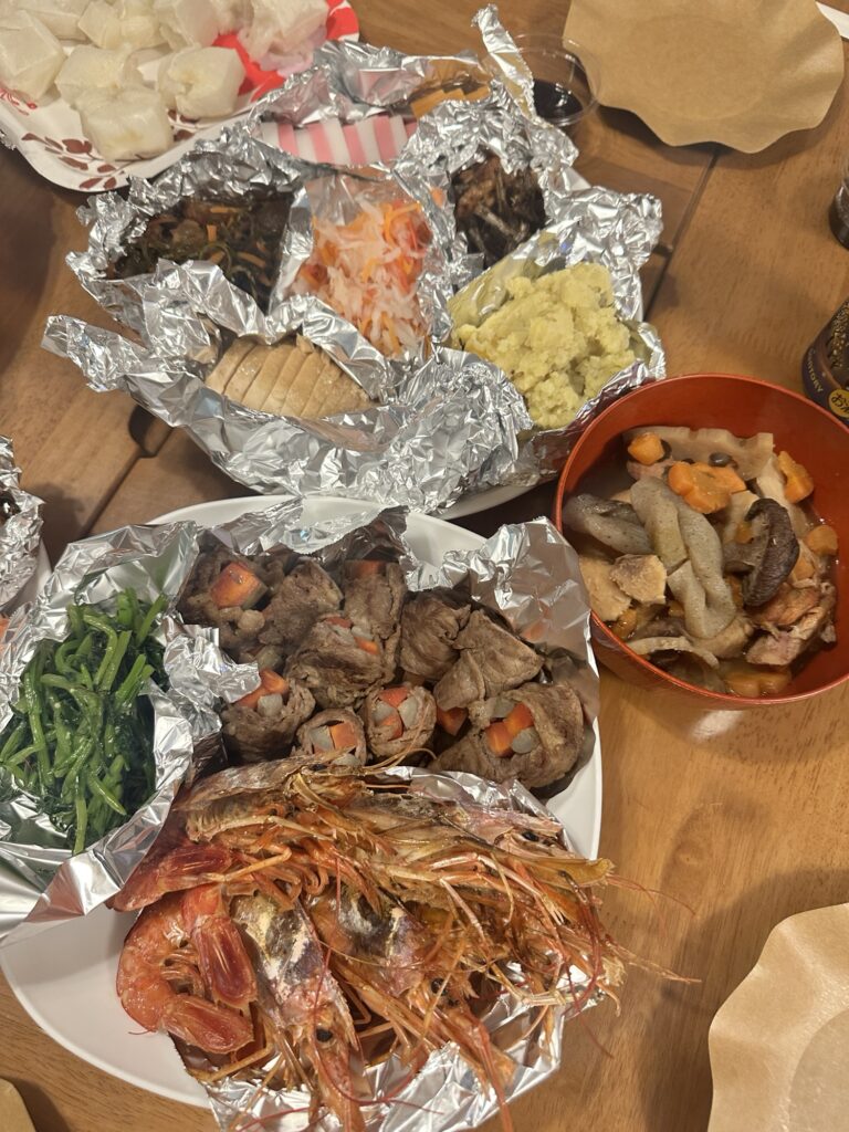 そして正月みをだすべく、お決まりの自分の首をしめおせち…飯炊きババアです。しかも、お重がないので、アルミホイルで仕切るワイルドスタイル。
