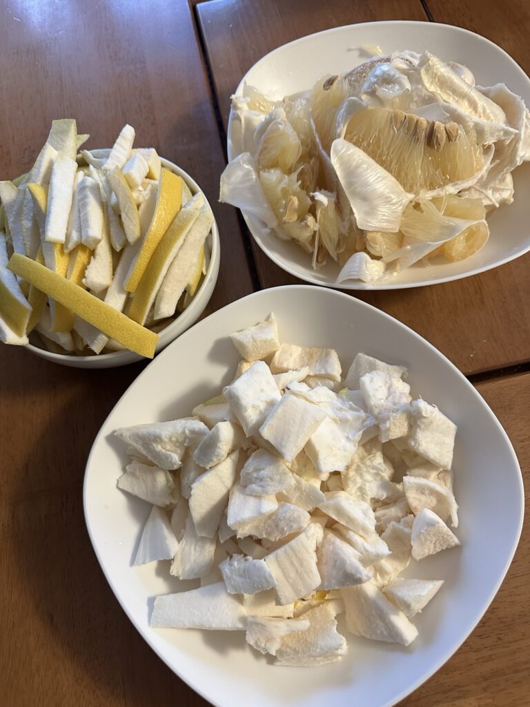 皮も食べれるそうで、白いところだけ切り取って酢で煮ました…そして砂糖でさらに煮て乾燥させるそうですが、何だか嫌な予感したんですが、まあ乾燥しない。