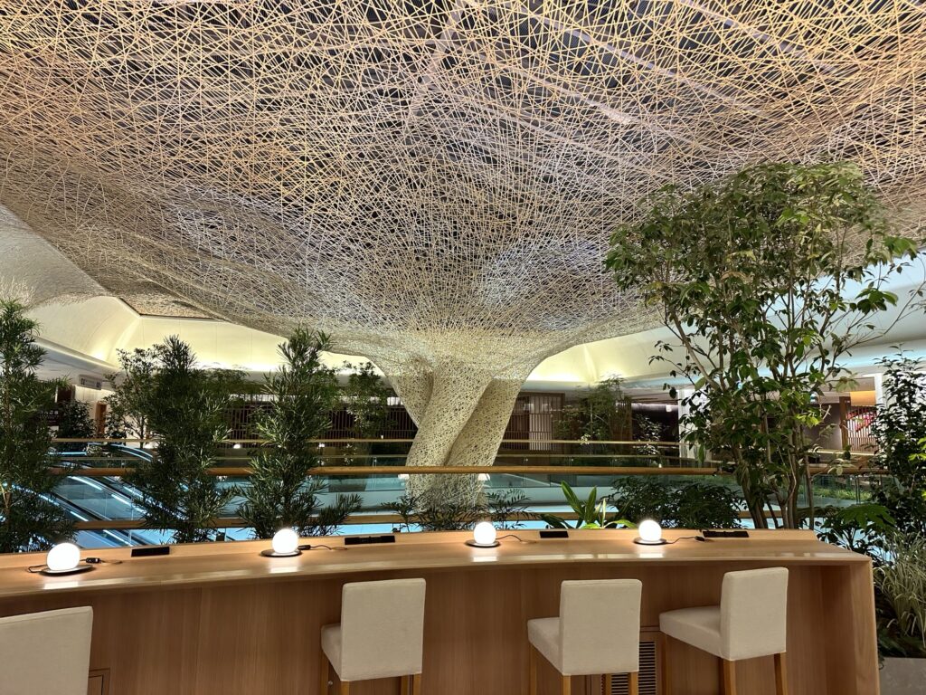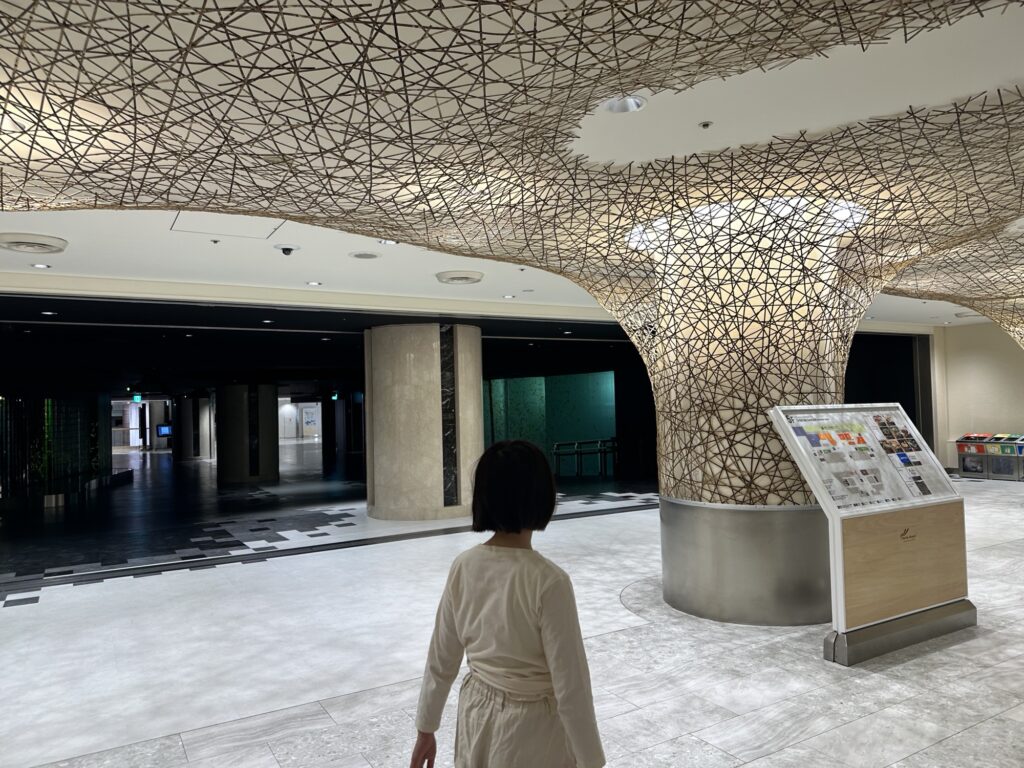 ご馳走様ーからの、いざや展望デッキ方面へ。天井のアミアミがすごいです。竹だそう。